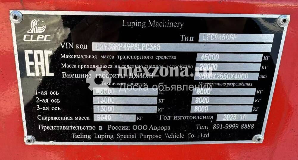 Производитель: «Teiling luping Special Purpose Vehicle Co., Ltd» Китай Цементовоз полуприцеп, марка: «CLPC» модель: LPC9450GF с дизельным двигателем и компрессором. Общий объем резервуара 38 м3 Собственный вес 8 400 кг Грузоподъёмность - 45000 кг Высота ССУ: 1400мм 3 оси- 13тонные Подвеска «FUWA» зависимая, рессорно-балансирная с реактивными штангами на всех осях Внешние габариты (Д*Ш*В), мм 9500*2550*4000 Шкворень на 50 и 90. Опорное устройство -20т, Ящики для инструмента (ш*в*г) – 1200*600*1200 мм - 2 шт Количество листов в рессорах-10 Количество колес-12 +1 запаска, Шины: «TRIANGLE» 315/80R22.5 индекс несущей способности 157\154 Рабочая тормозная система: пневматическая, двухпроводная с АВС Стояночная: привод от пружинных энергоаккумуляторов к тормозным механизмам колес второй и третей оси Колея (передняя/задняя),-/1840/1840/1840мм Колесная база: 4800+1310+1310мм В комплекте: противооткатные упоры, ступичный ключ, балонный ключ, монтажка. Стоимость полуприцепа LPC9450GF в Благовещенске с НДС 450 000 юаней