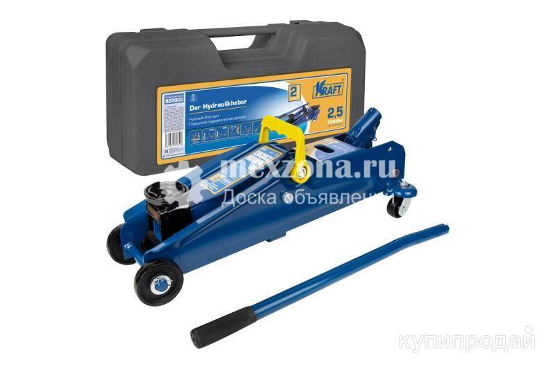 Подкатной гидравлический домкрат KRAFT 2.5 т, кейс KT 820003 предназначен для плавного поднятия автотранспорта на высоту до 385 мм.